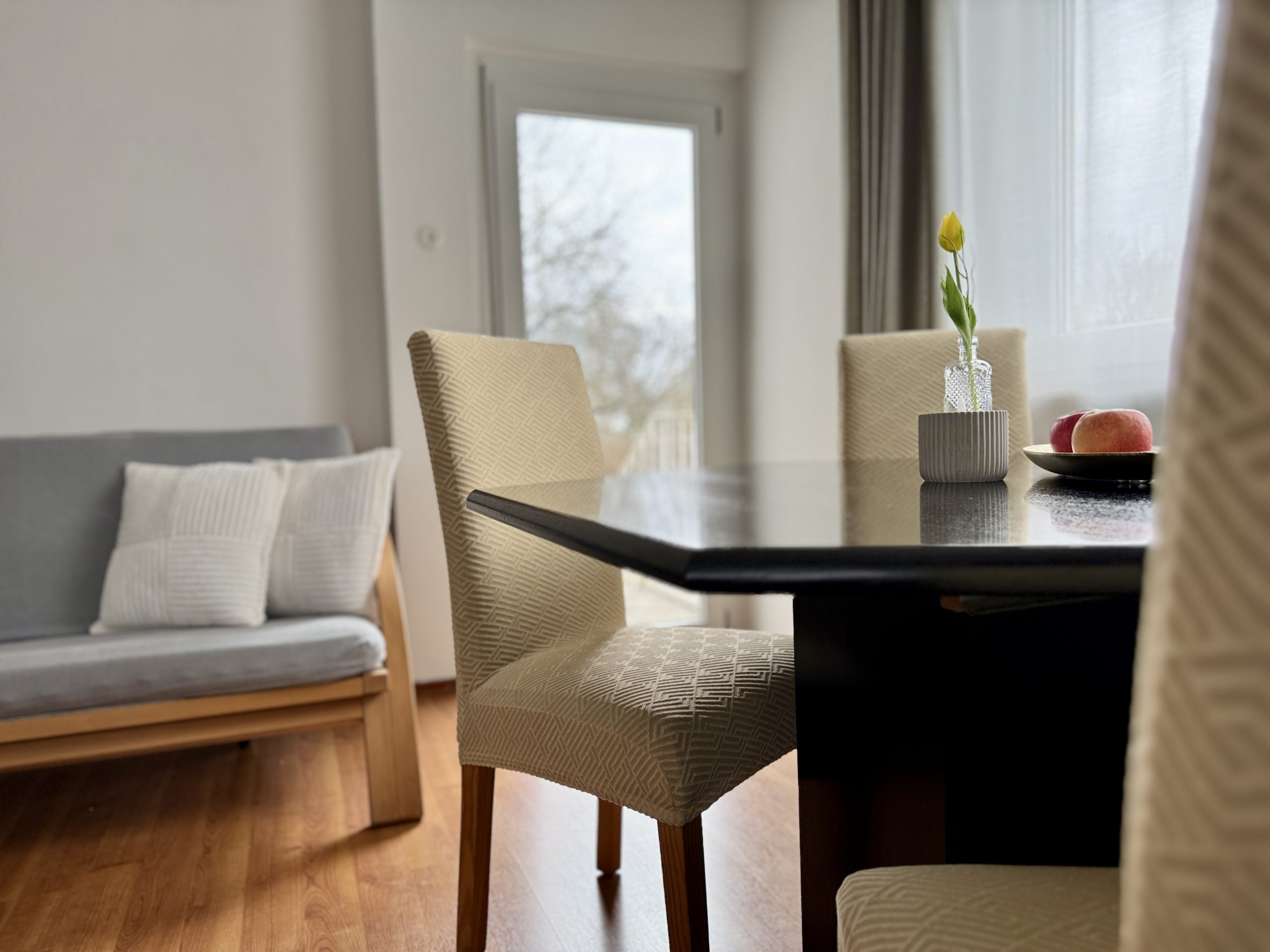 Wohnzimmer mit gemütlicher Sitzgruppe und integriertem Esszimmer, SAT-TV, Wlan, Zugang zur Süd-Terrasse und Garten (Südrichtung).
